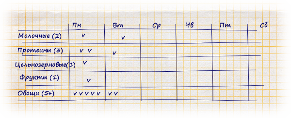 Для удобства ведите дневник. В начале недели отметьте на каждый день клетки с количеством порций всех пяти видов продуктов. После каждого употребления пищи отмечайте галочкой использованные порции. Отмечайте свой вес в начале и в конце каждой недели. Вы сможете наблюдать, как худеете. Это поможет Вам придерживаться правильного питания и дальше. А также обрадует вас, что тоже очень полезно для похудения)